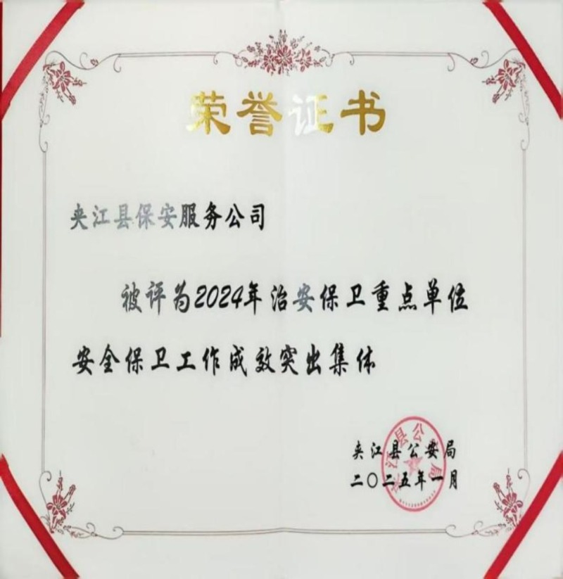 本网讯(通讯员 王书红)近日,夹江县保安服务公司凭借在安保领域卓越表现,荣获夹江县公安局颁发的“2024年治安保卫重点单位、安全保卫工作成效突出集体”荣誉证书。