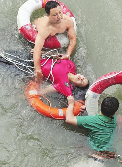 危急时刻,附近某食府保安黄波也加入到了营救过程中,两人协力从两侧拽住女子胳膊,奋力把女子拖出水面,使劲地朝岸边游去。“加油啊,赶紧往岸边划!119马上就到了!”岸上的人齐声呼喊着。两人拽着女子使劲游到岸边,但岸边陡峭,上不了岸,上游的码头也有近30米距离。无奈,两人只好用一只手抓住栏杆中间的花台,另一只手拖着女子,使劲往上举,由于水深踩不到底,只好一直做得踩水动作,因为水深踩不到底,两人一直做着踩水动作,足足坚持了10分钟。这时,消防官兵赶到了现场,马上放下了救援绳和救生圈,此时,两个小伙子才借到了力。岸上的人拉着绳,带着3人往上游的码头靠。跳水女子终于得救了,而这两名英雄走路都有点踉跄,看上去明显疲惫,嘴巴喘着大气。