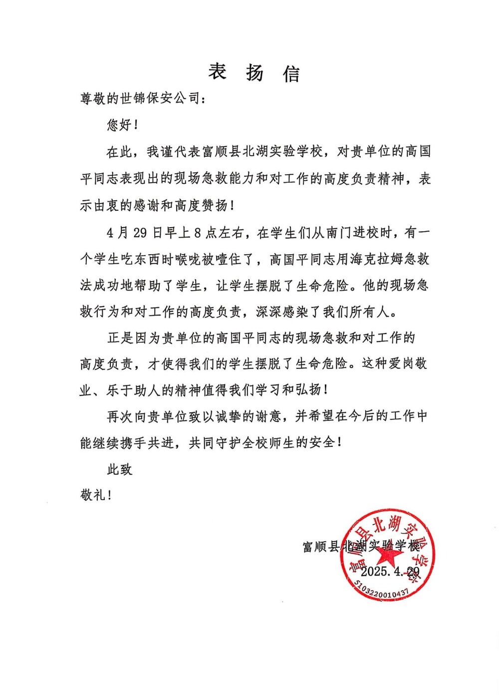 在这千钧一发的紧急关头,富顺县世锦保安服务有限公司派驻北湖实验学校的保安员高国平,以他高度的职业敏感性和责任心,迅速反应,果断行动。他毫不犹豫地推开周围因惊慌而围观的学生,第一时间冲到受噎学生身旁。凭借着在公司日常培训中扎实掌握的专业知识与技能抱起濒临危险的学生,冷静沉着地运用海姆立克急救法进行施救。在他精准且有力的操作下,时间仿佛都为生命让路,经过一番紧张而有序的急救,学生终于成功脱离了生命危险,恢复了正常的呼吸和意识。