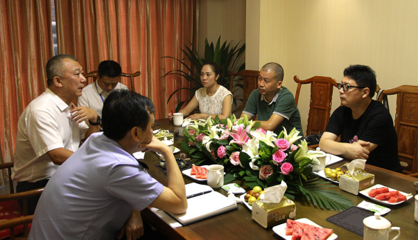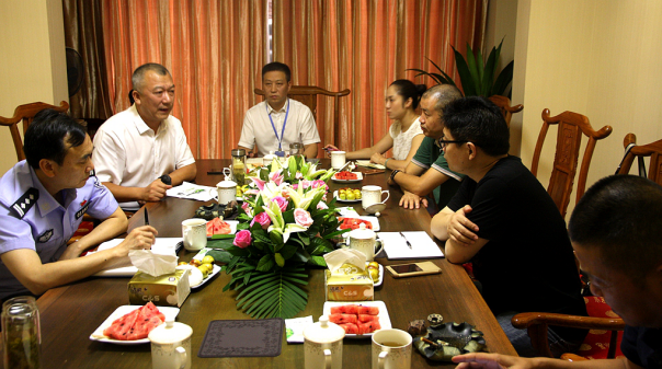 省保安支队支队长白马仁真(右一)、省保安协会秘书长何辉元(右二)听取自贡保安公司董事长秦东海(左二)工作汇报。