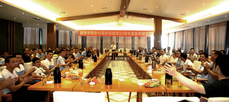 本网讯(通讯员 黄其友)7月28日下午,火热的骄阳炙烤着盐都大地。自贡市保安服务有限责任公司83名退伍军人代表不畏酷暑欢聚一堂,热烈庆祝中国人民解放军建军90周年。公司董事长秦东海、副总经理陈伟、副书记陈义友、监事会主席张兴勇参加座谈。董事长代表公司临时党委向参加座谈会的复员退伍军人表示节日的祝贺,向他们爱岗敬业、无私奉献的工作精神和雷厉风行、令行禁止的工作作风表示赞扬,感谢他们为自贡保安公司的发展壮大做出的积极贡献。